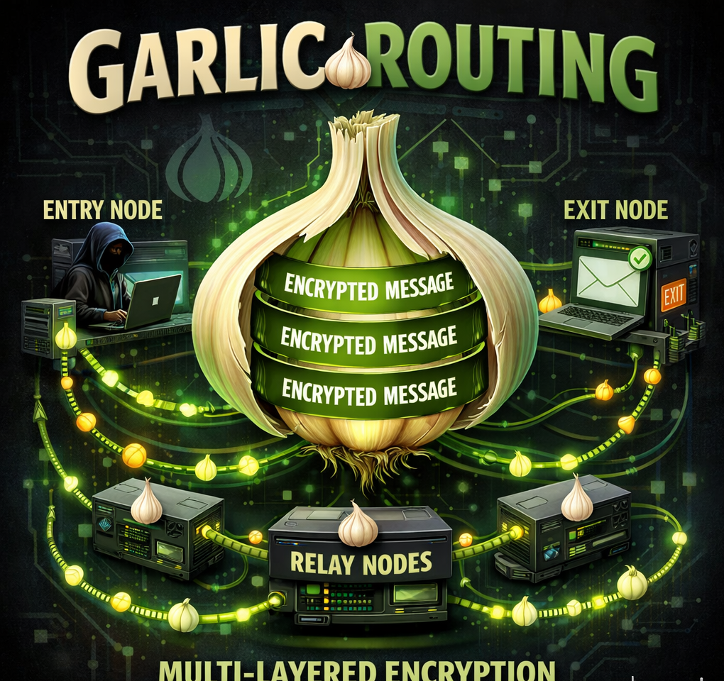 If you know Tor, you’ve heard of “Onion Routing,” where data is wrapped in multiple layers of encryption. I2P takes this a step further. In Garlic Routing, multiple messages (called “cloves”) are bundled together into a single encrypted packet.